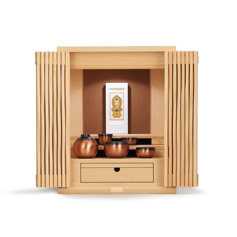 《商品説明》 商品 無垢材を使用し、「うねり」のある格子状にした「扉」が特徴のお仏壇です。