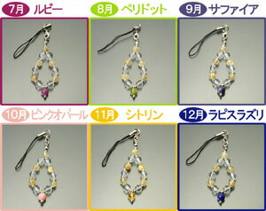 水晶とルチルをベースに、1月〜12月それぞれの誕生石をセットした天然石のストラップです。