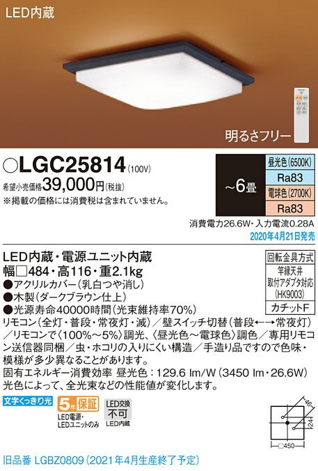【最安値挑戦中!最大25倍】パナソニック LGC25814 和風シーリングライト 天井直付型 LED(昼光色〜電球色) リモコン調光・調色 カチットF 〜6畳 木製枠 ダークブラウン